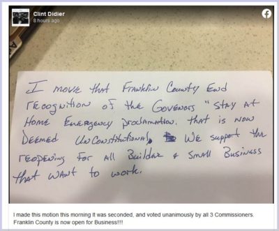 The motion by Commissioner Clint Didier read, “I move that Franklin County end recognition of the governor’s stay at home emergency proclamation that is now deemed unconstitutional. We support the reopening for all builders and small businesses that want to work.”