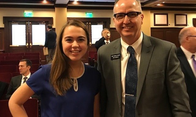For me, being an economics teacher is fun. One reason is, well, its economics—practically synonymous with fun. Another reason is I get to teach and work with some amazing students. This session, I get the extra bonus of seeing and working with one of my star economics students. She is Emma Schwarze, and she is working in the Capitol as an intern for Veritas Advisors during the 2018 Legislative Session. They are lucky to have her on board and she’s doing a great job! Here we are enjoying a morning in the Revenue and Taxation Committee.
